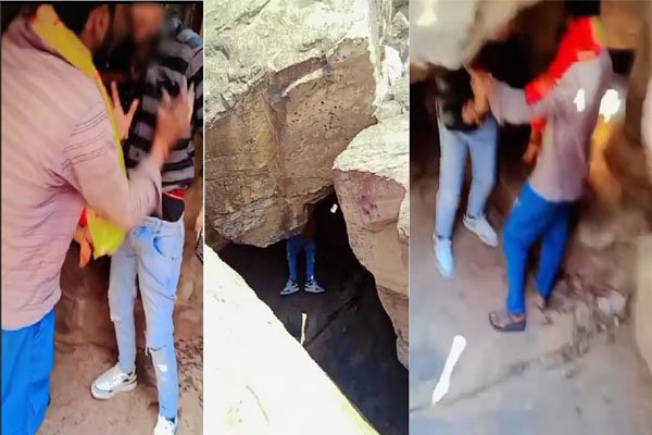 सोशल मीडिया में एक वीडियो सामने आया है जिसमें गुफानुमा चट्टान के नीचे प्रेमी जोड़े आपत्तिजनक हालत में दिखते हैं। इसी दौरान बदमाश किस्म के दो युवक उनके पास आते हैं और गाली-गलौज कर उनकी तलाशी लेते हुए पैसों की मांग करने लगते हैं। इस दौरान एक युवक उनका वीडियो बनाता रहता है।