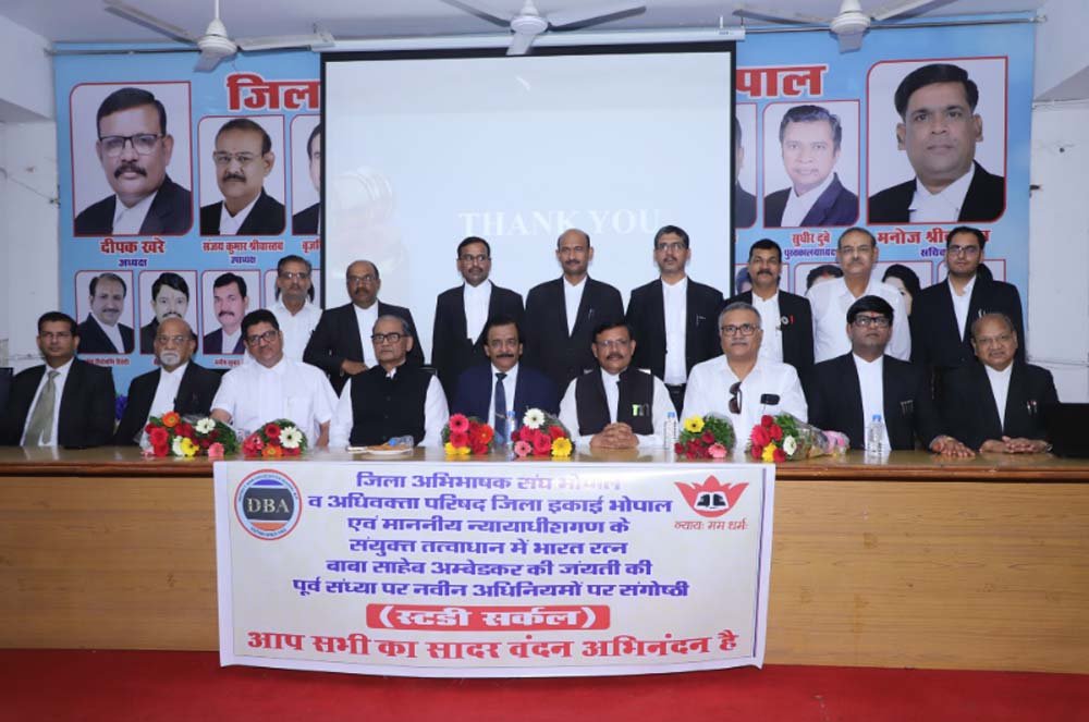 भोपाल जिला बार एसोसिएशन और अधिवक्ता परिषद जिला इकाई के तत्वाधान में शनिवार को नवीन कानूनों पर एक संगोष्ठी (स्टडी सर्कल) का आयोजन किया गया है। जिसमें अतिथि के रूप में जिला एवं सत्र न्यायाधीश अमिताभ मिश्र, जिला न्यायाधीश नीतिराज सिंह सिसोदिया, अरविंद शर्मा, स्वमं प्रकाश दुबे शामिल हुए तथा संगोष्ठी को संबोधित किया। “भारत रत्न बाबा भीमराव अंबेडकर की जयंती की पूर्व संध्या “ पर आयोजित संगोष्ठी (स्टडी सर्कल ) को जिला एवं सत्र न्यायाधीश अमिताभ मिश्र, चेयरमैन स्टेट बार विजय चौधरी और को-चेयरमैन स्टेट बार राजेश व्यास ने संबोधित किया।