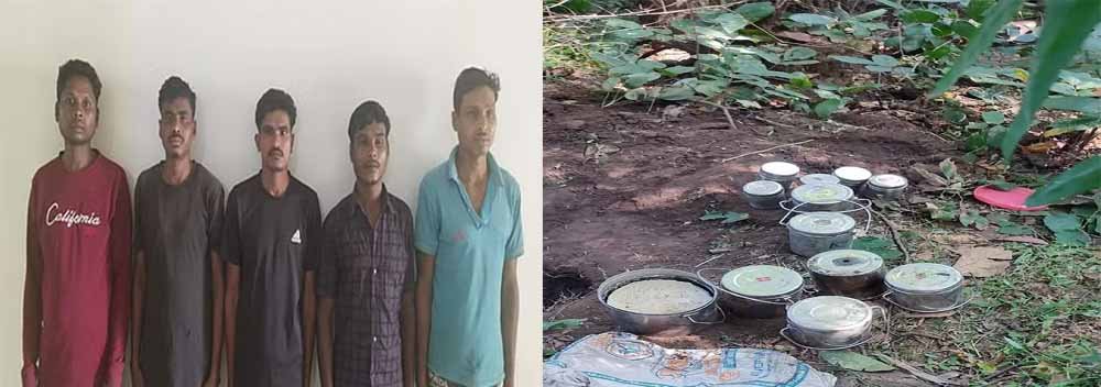 पूछताछ करने पर अपना नाम हड़मा मड़कामी उर्फ बुडदा पिता भीमा मड़कामी उम्र 27 निवासी ईचवाडापारा पोटेनार, रमेश अवलम उर्फ बोज्जा पिता सुक्कू अवलम उम्र 23 निवासी मोकोडपारा गदामली, कुमारू लेकाम उर्फ महरु पिता पाकलु लेकाम उम्र 28 निवासी सरपंचपारा पोटेनार, मड्डडा राम पोडियामी उर्फ अनिल पिता मासो पोडियामी उम्र 25 निवासी ककड़ीपारा कोतरापाल व बोमड़ा कुहरामी पिता हूंगा उम्र 35 निवासी बेंचरम स्कूलपारा जांगला थाना शामिल हैं। पकड़े गए संदिग्धों से दो कुकर बम, दो टिफिन बम, पांच मीटर कार्डेक्स वायर, 65 मीटर इलेक्ट्रिक वायर, दो डेटोनेटर व नक्सली बैनर पर्चा बरामद किया गया हैं। पकड़े गए संदिग्धों के विरुद्ध जांगला थाना में वैधानिक कार्यवाही के बाद न्यायिक रिमांड पर न्ययालय बीजापुर में पेश किया गया हैं।