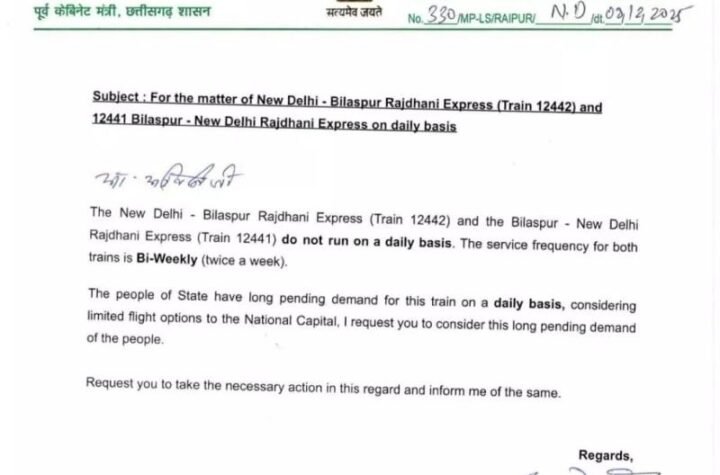 रायपुर। छत्तीसगढ़ की राजधानी और उत्तर भारत के बीच बेहतर रेल कनेक्टिविटी सुनिश्चित करने के उद्देश्य से बिलासपुर–नई दिल्ली राजधानी...
