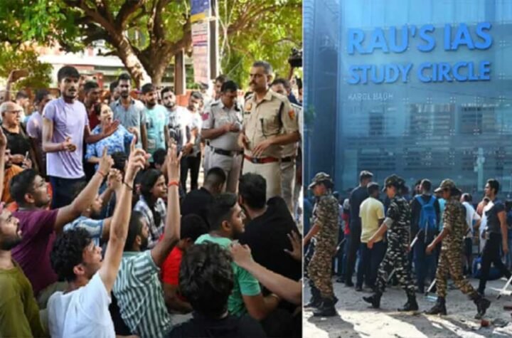 नई दिल्ली दिल्ली के ओल्ड राजेंद्र नगर इलाके में शनिवार को भारी बारिश के बाद राव आईएएस कोचिंग सेंटर (Rau...