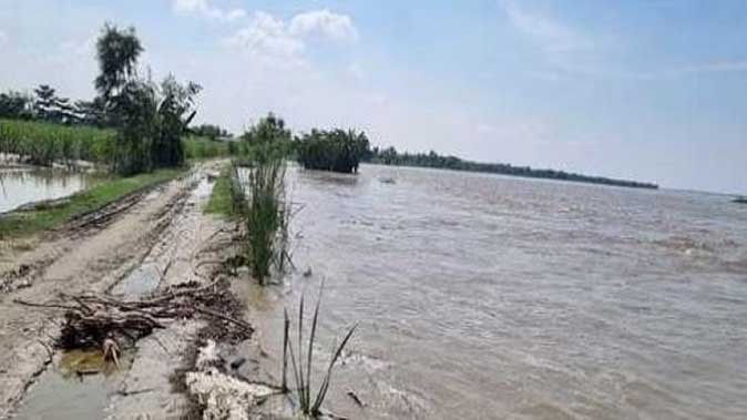 लखीमपुर शारदा नदी में आए उफान की वजह से रविवार को मजरा दंबलटांडा से लेकर रैनागंज तक बना परियोजना तटबंध...