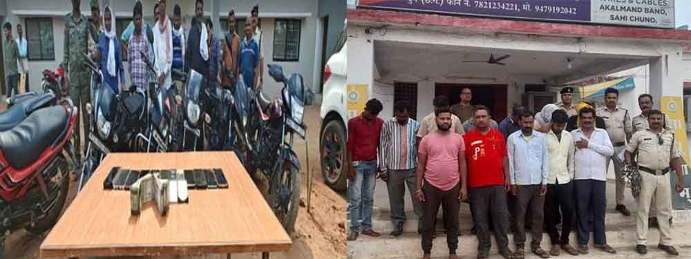 क्राइम ब्रांच एएसपी रिचा मिश्रा ने बताया कि धमधा थाना में जुआ का बड़ा फड़ संचालित किया जा रहा है। जिसके बाद क्राइम ब्रांच और धमधा थाना पुलिस की संयुक्त टीम ने शिवनाथ नदी के किनारे कुछ लोग जुआ खेलते गिरफ्तार किया रहे हैं। वही पुलिस को देखकर जुआरियों में भगदड़ मच गई। पुलिस ने मौके से सतीश कुमार नवरंग निवासी ग्राम मुरकुटा बेमेतरा, गजेंद्र साहू निवासी ग्राम चिरचार बालोद, अनिल टंडन निवासी ग्राम सीताडबरी खैरागढ़, छुईखदान गंडई (केसीजी), उधो कुमार कुर्रे निवासी रौंदा, धमधा, सुकालू दास खुटेल निवासी ग्राम लाखाटोला, कबीरधाम, शिव सिंह निवासी ग्राम कोपेडबरी बेमेतरा, जयंत वर्मा निवासी कोदवा बेमेतरा, शरद कुमार वैष्णव निवासी ग्राम भंडारपुर, कबीरधाम, मनीष बारले निवासी रौंदा धमधा, योगेश साहू निवासी जोरातराई राजनांदगांव, प्रदीप मोटवानी निवासी हाऊसिंह बोर्ड पद्मनाभपुर और मेहताब सिंह निवासी कबीरधाम को गिरफ्तार किया।