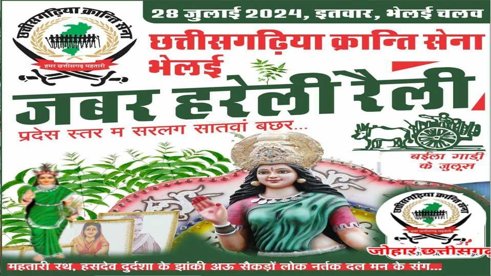 रविवार 28 जुलाई को छत्तीसगढ़िया क्रान्ति सेना के तत्वावधान में अंबेडकर मूर्ति, पावरहाउस भिलाई से लगातार सातवीं बार जबर हरेली रैली निकलेगी । इस रैली में हजारों लोक कलाकार एवं लाखों छत्तीसगढ़ियाजन अपने प्रथम त्यौहार हरेली को उल्लासमय वातावरण में मनाते चलेंगे । सुसज्जित बैलगाड़ियों का जूलूस, बस्तरिहा रेला-पाटा, गेड़ी, पंथी, करमा, सुवा, राऊत नाचा, डंडा नृत्य करते हुए लोग प्रकृति के साथ-साथ अपनी मूल संस्कृति को बचा कर रखने का संदेश देते चलेंगे । छत्तीसगढ़ महतारी और छत्तीसगढ़िया महापुरुषों की झांकी, हसदेव जंगल रक्षा का संदेश देती चलित झांकी रैली के विशेष आकर्षण होंगे ।