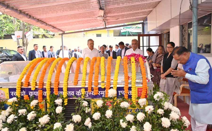 मुख्यमंत्री श्री विष्णु देव साय राजधानी रायपुर स्थित पाटन सदन पहुंचे। उन्होंने पाटन सदन में पूर्व  मुख्यमंत्री श्री भूपेश बघेल के पिता स्वर्गीय श्री नंदकुमार बघेल के पार्थिव शरीर पर पुष्प अर्पित कर उन्हें श्रद्धांजलि अर्पित की।