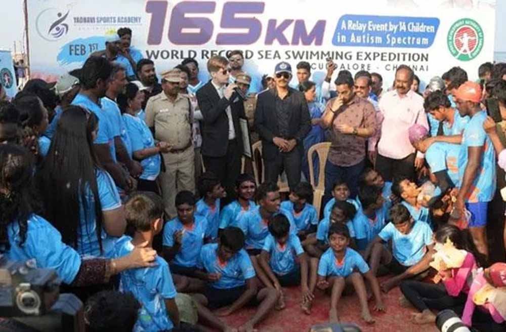 ऑटिज्म स्पेक्ट्रम डिसऑर्डर (एएसडी) से पीड़ित बच्चों के एक समूह ने कुड्डालोर से चेन्नई तक 165 किलोमीटर तैराकी करके नया विश्व रिकॉर्ड बनाया। नौ से 19 वर्ष के 14 बच्चों ने गजब की प्रतिबद्धता दिखाई और तमिलनाडु के तटीय क्षेत्र में तैराकी करके इतिहास रचा। इस समुद्री तैराकी अभियान का आयोजन रिले प्रारूप में किया गया था। इस दौरान उनके ट्रेनर नाव में सवार थे।