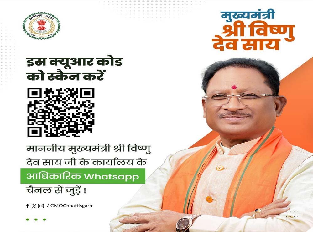 प्रदेश के लोग सीधे वॉट्सऐप के जरिए सीएम विष्णु देव साय से संवाद स्थापित कर सकेंगे. इस चैनल से कोई भी व्यक्ति जुड़ सकता है. इस चैनल के माध्यम से लोग आसानी से अपने विचार और चिंताएं सीएम कार्यालय के साथ शेयर कर सकते हैं