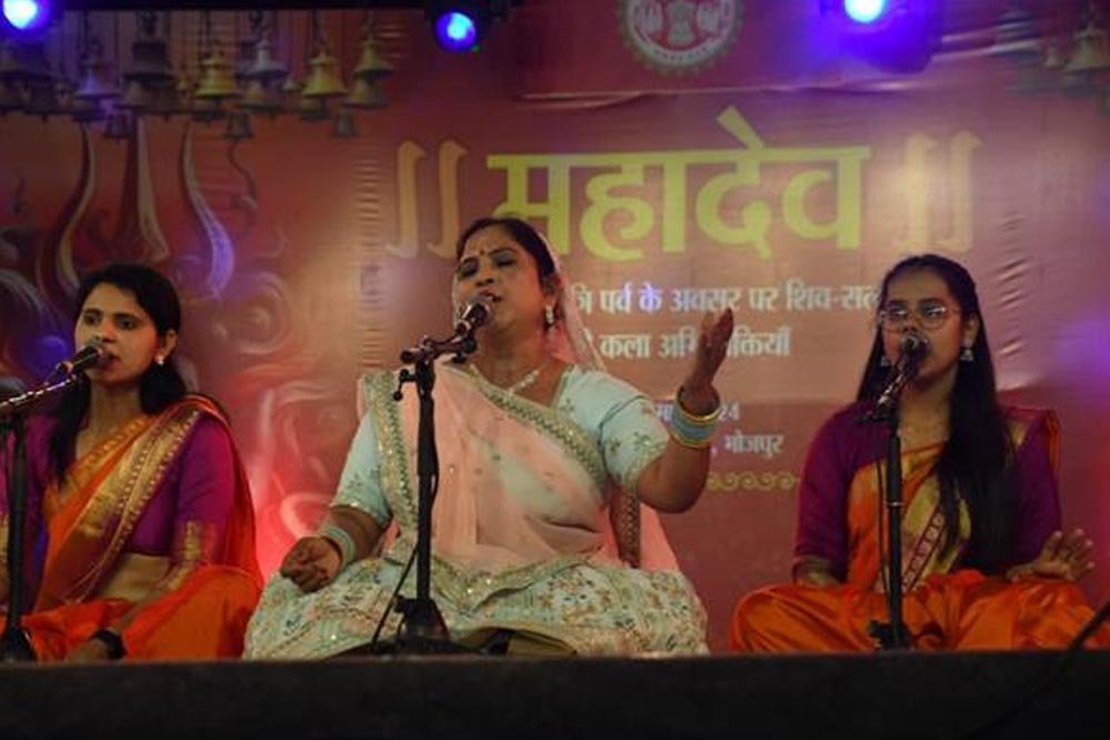 शीतल शाम और आध्यात्मिक वातावरण में सांस्कृतिक स्वर—छंद ने कला रसिकों को आत्मिक आनंद से भर दिया। प्रस्तुतियों का सिलसिला शुरू हुआ लोकगायन से, जिसमें सुशीला त्रिपाठी एवं साथी, भोपाल ने लोक की परंपराओं में महादेव के प्रति आस्था को स्वरों में प्रस्तुत किया। उन्होंने सर्वप्रथम भोला सजाए लाए पालकी…. दादरा प्रस्तुत किया। इसके बाद राग पीलू में कहरवा पेश किया, जिसके बोल थे भोला सजी के चले हैं….। प्रस्तुति को आगे बढ़ाते हुए उन्होंने मोरे अंगना मा आय भोलेनाथ…., फागुन शिव बउराने…., कितहू देखव ओ मेरी सखिया…., मांगू में वरदान भोला तोरे मंदिर मा…. की प्रस्तुति से श्रोताओं को भक्ति रस में भिगो दिया। उन्होंने प्रस्तुति का समापन कहरवा गाकर किया, जिसके बोल थे मईया झूले झूलना….। सुशीला त्रिपाठी के साथ हारमोनियम पर मांगीलाल ठाकुर, की—बोर्ड पर पंकज राव, बांसुरी पर सुमित प्रजापति, तबले पर तरुण यादव, ढोलक पर मोहित ठाकुर, परकशन पर शुभम नायक और सह—गायिका में सुराजकुमारी वर्मा और सुभूमि शर्मा ने साथ दिया।
