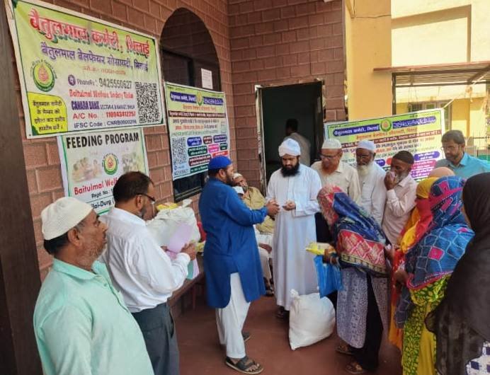 बैतुलमाल वेलफेयर सोसाइटी भिलाई ने पिछले साल की तरह रमजान माह के दौरान मुस्लिम कम्युनिटी हॉल सेक्टर-6 और विवेकानंद नगर में आइडियल पब्लिक स्कूल के पास गरीबों एवं जरूरतमंदों को राशन किट वितरण किया। इसकी शुरूआत जामा मस्जिद सेक्टर-6 के इमाम खतीब हाफिज इकबाल अंजुम हैदर के हाथों की गई। बैतुलमाल कमेटी के तमाम ओहदेदार इस मौके पर मौजूद थे। अल मदद एजुकेशन एंड वेलफेयर सोसाइटी ने माहे रमजान के मुबारक महीने में लगभग 150 परिवारों के बीच राशन व जरूरत का सामान तकसीम किया। दुर्ग, पावर हाउस, कैंप-1, जामुल, रूआबांधा बस्ती, मरोदा बस्ती, विभिन्न सेक्टर क्षेत्र, खुसीर्पार, कोहका व अन्य हिस्सों में गरीब बस्तियों में यह राशन बांटा गया। इसके साथ ही उच्च शिक्षा ले रहे गरीब व वंचित परिवार के विद्यार्थियों को दस हजार रूपए चेक के माध्यम से दिए गए।