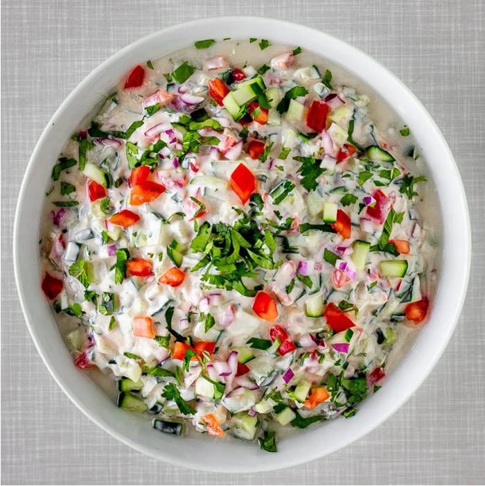- अब इस फेंटे हुए दही में कद्दूकस किया हुआ खीरा और गाजर मिलाएं। साथ ही, बारीक कटा हुआ प्याज और टमाटर भी डाल दें।