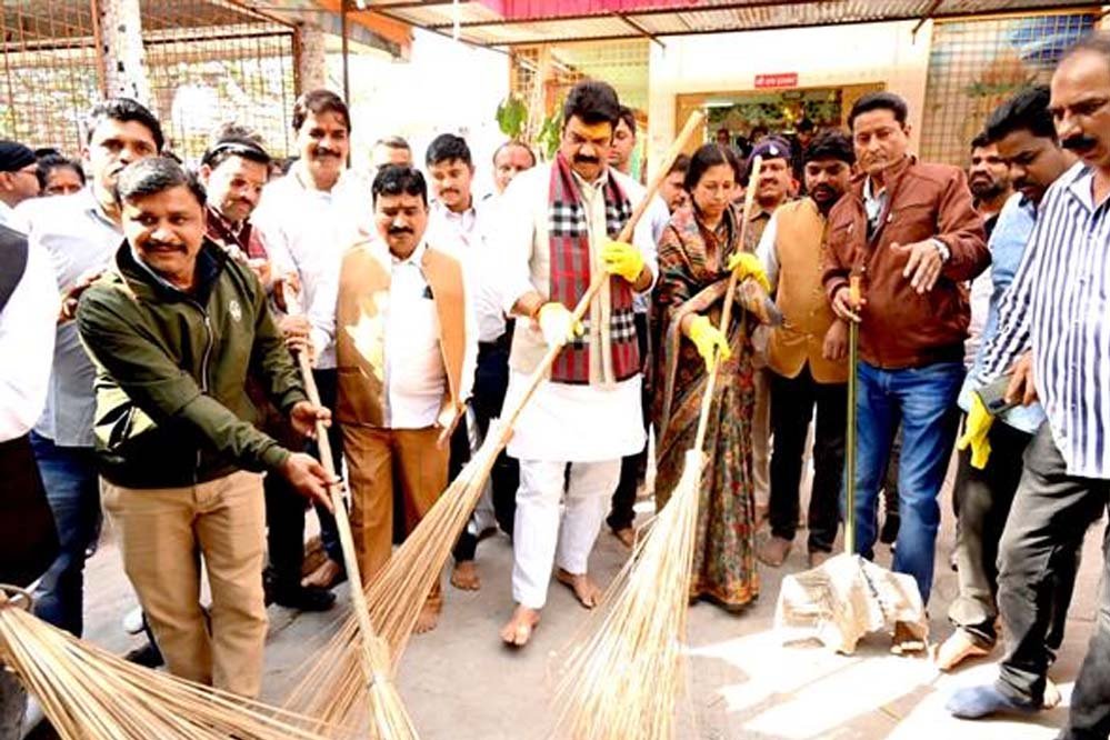 राज्य मंत्री श्रीमती गौर ने मंदिर में लगाया झाडू-पोछा
