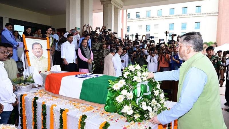 रांची: झारखंड के दिवंगत शिक्षा एवं निबंधन मंत्री रामदास सोरेन को शनिवार सुबह झारखंड विधानसभा में राजकीय सम्मान के साथ विदाई दी गई। राज्यपाल संतोष कुमार गंगवार, विधानसभा अध्यक्ष रवींद्रनाथ महतो, नेता प्रतिपक्ष बाबूलाल मरांडी, संसदीय कार्य मंत्री राधा कृष्ण किशोर समेत कई मंत्री, विधायक और सांसदों ने उनके पार्थिव शरीर पर पुष्प चढ़ाकर श्रद्धांजलि अर्पित की।