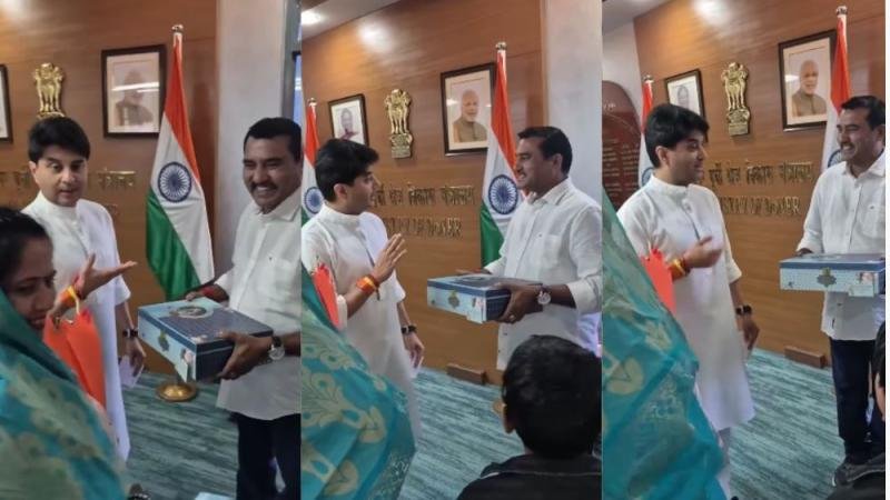 दरअसल, ग्वालियर जिला पंचायत सदस्य अनूप कुशवाह अपनी बेटी की शादी का निमंत्रण लेकर केंद्रीय मंत्री ज्योतिरादित्य सिंधिया के पास दिल्ली पहुंचे। अनूप कुशवाह ने अपनी बेटी की शादी का कार्ड केंद्रीय मंत्री को दिया, तो उन्होंने पूछा कि किसकी शादी है? अनूप कुशवाह ने कहा- बेटी की शादी है फिर उन्होंने पूछा कितनी बेटियां है। इस पर जिला पंचायत सदस्य की पत्नी ने कहा – तीन बेटियां हैं, अनूप कुशवाह ने कहा कि दो बेटियों की शादी हो चुकी है। आखिरी बेटी की शादी है ज्योतिरादित्य सिंधिया ने अनूप कुशवाह से कहा कि अब तुम तो मुझे शर्मिंदा कर रहे हो, युवराज साहब 30 साल के हो गए। अब तो उनकी जल्दी शादी पक्की करानी पड़ेगी. दोनों के बीच ये हल्का-फुल्का अंदाज सोशल मीडिया पर वायरल हो रहा है।