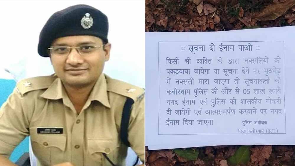 दरअसल छत्तीसगढ़ में BJP की सरकार बनने के बाद नक्सलियों के खिलाफ ताबड़तोड़ कार्रवाई चल रही है. चुनावी सभा में गृहमंत्री ने भी छत्तीसगढ़ से नक्सलियों के सफाए का ऐलान कर दिया है. इस बीच कबीरधाम पुलिस ने भी एक अनोखी पहल करते हुए नक्सलियों की सूचना देने वालों को 5 लाख रुपये का इनाम देने की घोषणा की है. इसके लिए जगह-जगह पर्चे भेजे रहे हैं. जिले के नक्सल प्रभावित बॉर्डर के गांवों में 35000 लोगों के मोबाइल पर इसका मैसेज भी पुलिस ने भेजा है. जिसमें ये कहा गया है कि नक्सलियों की सूचना देने, सरेंडर करवाने और एनकांउटर में नक्सली के मारे जाने पर सूचना देने वाले को 5 लाख रुपये का इनाम तुरंत दिया जाएगा. साथ ही पुलिस विभाग में सरकारी नौकरी दी जाएगी. SP के इस ऐलान की चर्चा प्रदेश में जोरों पर हो रही है.