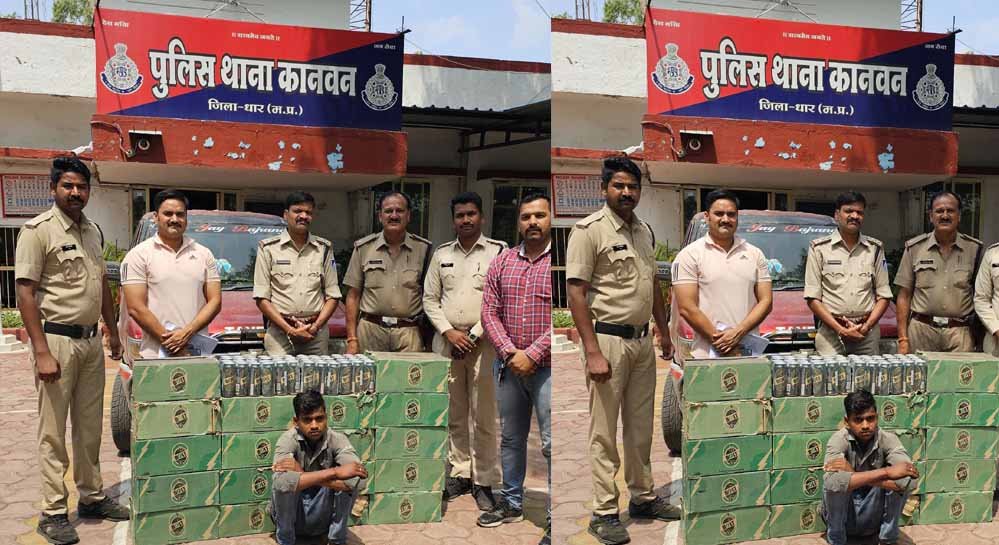 पुलिस अधीक्षक मनोज कुमार सिंह द्वारा सम्पूर्ण जिले में लोकसभा चुनाव को देखते हुए अवैध शराब के परिवहन पर अंकुश लगाने व शराब माफियाओं की धरपकङ कर लगातार कार्यवाही करने हेतु निर्देशित किया गया है जिसके अनुसार अतिरिक्त पुलिस अधीक्षक डा. इंद्रजीतसिंह बाकलवार के निर्देशन एवं SDOP बदनावर शेरसिंह भूरिया के मार्गदर्शन में कानवन थाना प्रभारी रामसिंह राठौर की टीम द्वारा अवैध शराब के परिवहन पर अंकुश लगाने हेतु दिनांक 19.04.2024 की रात्रि में मुखबिर सूचना पर ग्राम भोईंदा मे बिडवाल रोड पर नाकाबंदी कर लाल रंग की टवेरा कार क्रमांक GJ 16 BB 2952 में भरी हुईं 20 पेटिंया बोल्ट प्रिमियम स्ट्रांग बियर कैन शराब की भरीं हुई कुल 480 बियर कैनें कीमती 52000 रुपये तथा घटना में प्रयुक्त टवेरा कार क्रमांक GJ 16 BB 2952 कीमती 7 लाख रुपये मौके पर विधिवत जप्त की गई तथा आरोपी नितेश पिता प्रकाश जाति बलाई उम्र 19 साल निवासी ग्राम मौसार को गिरफ्तार किया गया।
