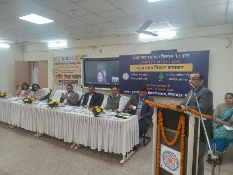 बिलासपुर। गुरु घासीदास केंद्रीय विश्वविद्यालय में शिक्षा संस्कृति उत्थान न्यास, नई दिल्ली एवं भारतीय उद्यमिता विकास संस्थान (EDII), अहमदाबाद के संयुक्त तत्वावधान में 12 दिवसीय सूक्ष्म उद्यमिता विकास कार्यक्रम का भव्य शुभारंभ किया गया। कार्यक्रम का उद्देश्य विद्यार्थियों एवं नवयुवाओं में उद्यमशील सोच को विकसित करना, स्वरोज़गार के अवसरों की पहचान कराना तथा नवाचार आधारित उद्यमिता को प्रोत्साहित करना रहा। कार्यक्रम में विशेष अतिथि के रूप में भारतीय उद्यमिता विकास संस्थान अहमदाबाद से डॉ. सुनील शुक्ला उपस्थित रहे। वहीं, शिक्षा के क्षेत्र में राष्ट्रपति पुरस्कार से सम्मानित डॉ. अमित कुमार द्विवेदी ने विशिष्ट वक्ता के रूप में सहभागिता की। कार्यक्रम की अध्यक्षता विश्वविद्यालय के माननीय कुलपति महोदय प्रोफेसर आलोक चक्रवाल ने की। कार्यक्रम में विशिष्ट अतिथि के रूप में सौराष्ट्र विश्वविद्यालय की पूर्व कुलपति डॉ. नीलांबरी दवे उपस्थित थे। उक्त कार्यक्रम की संयोजक, शिक्षा संस्कृति उत्थान न्यास की विश्वविद्यालय ईकाई संयोजक प्रो. सीमा राय, सलाहकार प्रो. अनुपमा सक्सेना एवं कार्यक्रम समन्वयक विश्वविद्यालय इन्क्यूबेशन सेंटर तथा एमएमटीटीसी के निदेशक प्रो. आलोक कुमार सिंह कुशवाहा इस अवसर पर उपस्थित थे। उद्घाटन सत्र को संबोधित करते हुए डॉ. सुनील शुक्ला ने कहा कि आज के प्रतिस्पर्धात्मक युग में केवल डिग्री ही नहीं, बल्कि कौशल, नवाचार और जोखिम लेने की क्षमता भी उतनी ही आवश्यक है। उन्होंने विद्यार्थियों को स्टार्टअप संस्कृति, स्थानीय संसाधनों पर आधारित सूक्ष्म उद्यम तथा आत्मनिर्भर भारत की परिकल्पना से जोड़ने पर बल दिया। डॉ. अमित कुमार द्विवेदी ने अपने संबोधन में वर्तमान शिक्षा प्रणाली में उद्यमिता की भूमिका को रेखांकित करते हुए कहा कि शिक्षा का उद्देश्य केवल रोजगार पाना नहीं, बल्कि रोजगार सृजन करने वाला नागरिक तैयार करना होना चाहिए। उन्होंने विद्यार्थियों को व्यावहारिक शिक्षा, समस्या-समाधान आधारित सीख और सामाजिक उत्तरदायित्व के साथ उद्यम स्थापित करने के लिए प्रेरित किया। कुलपति महोदय ने अपने अध्यक्षीय वक्तव्य में कहा कि विश्वविद्यालय शिक्षा के साथ-साथ विद्यार्थियों को उद्यमशील बनने के लिए आवश्यक मंच, मार्गदर्शन और संसाधन उपलब्ध कराने के लिए प्रतिबद्ध है। उन्होंने विश्वास व्यक्त किया कि यह कार्यक्रम छात्रों को स्वरोज़गार एवं स्टार्टअप की दिशा में ठोस कदम उठाने में सहायक सिद्ध होगा। कार्यक्रम के दौरान प्रतिभागियों को सूक्ष्म उद्यमिता, व्यवसाय योजना निर्माण, वित्तीय साक्षरता, सरकारी योजनाओं एवं बाजार से जुड़ाव जैसे महत्वपूर्ण विषयों पर जानकारी दी गई। 