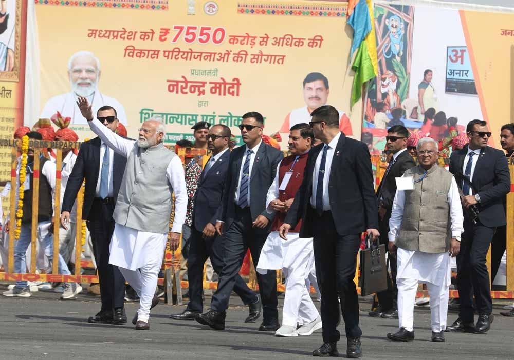 प्रधानमंत्री नरेंद्र मोदी ने आज आदिवासी बाहुल्य झाबुआ में जनजातीय सम्मेलन में शामिल होकर लोकसभा चुनाव में प्रचार का आगाज कर दिया है। इस कार्यक्रम के जरिए प्रधानमंत्री ने प्रदेश को 7500 करोड़ की सौगाते दी है। जिसमें से उन्होंने 6512 करोड़ रुपए के काम का लोकार्पण कार्यक्रम स्थल से किया। कार्यक्रम में उनके साथ मुख्यमंत्री डॉ. मोहन यादव सहित प्रदेश भाजपा के कई दिग्गज नेता मौजूद थे। इस जनजातीय सम्मेलन में एक लाख से ज्यादा लोग शामिल हुए। इससे पहले प्रधानमंत्री मोदी के यहां पर पहुंचते ही यहां के लोगों ने उनका परंपरागत तरीके से स्वागत करते हुए भगौरिया नृत्य की प्रस्तुति भी दी। प्रधानमंत्री नरेंद्र मोदी लगभग 11.40 बजे इंदौर पहुंचे। करीब दस मिनट यहां पर रुकने के बाद वे झाबुआ रवाना हुए। 12.20 पर वे झाबुआ के गोपालपुर हवाईपट्टी पर उतरे, यहां से वे कार्यक्रम स्थल पहुंचे। जहां पर उन्होंने पहले लोकार्पण और शिलान्यास किया। इसके बाद उन्होंने जनजातीय सम्मेलन को संबोधित किया।