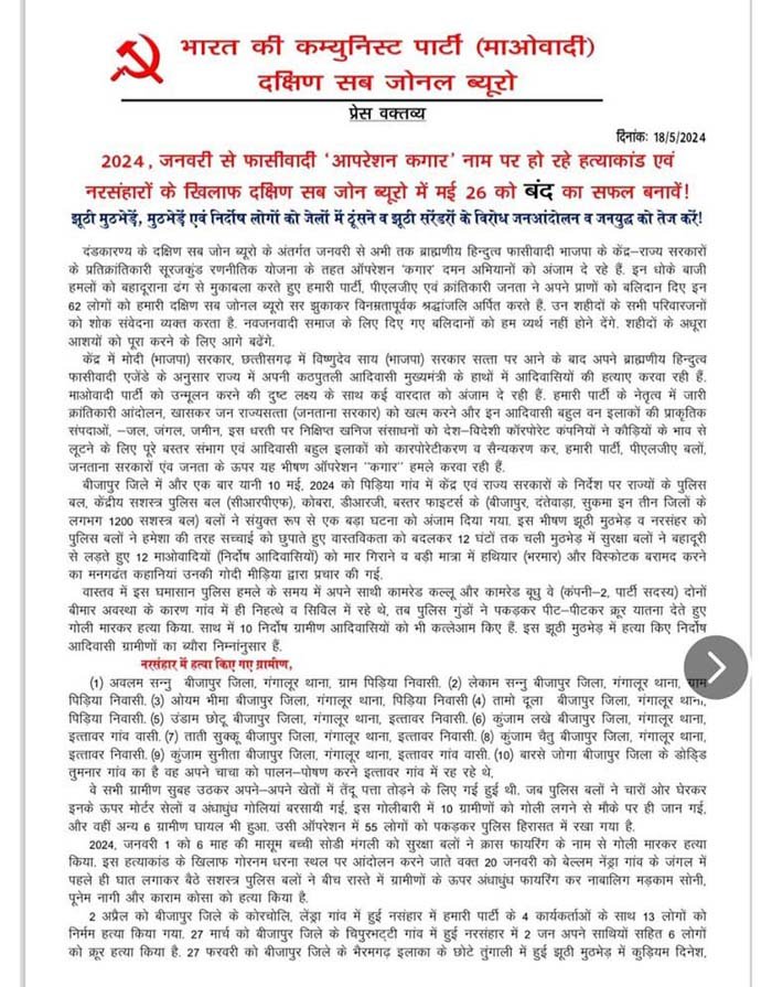 नक्सलियों के दक्षिण सब जोनल ब्यूरो ने प्रेस वक्तव्य जारी कर 26 मई को बंद का आह्वान किया है। नक्सलियों द्वारा जारी पर्चे में कहा गया है कि जनवरी 2024 से फासीवादी 'आपरेशन कगार' नाम पर हो रहे हत्याकांड एवं नरसंहारों के खिलाफ दक्षिण सब जोनल ब्यूरो में मई 26 मई को बंद को सफल बनाएं। झूठी मुठभेड़ों, निर्दोष लोगों को जेलों में ठूंसने व झूठे सरेंडरों के विरोध में जन आंदोलन व जनयुद्ध को तेज करने का आह्वान किया गया है। दक्षिण बस्तर के सब जोनल कमेटी के प्रवक्ता समता ने जारी पर्चे में कहा है कि फोर्स की कार्रवाई में उनके 62 लोग मारे गए हैं।