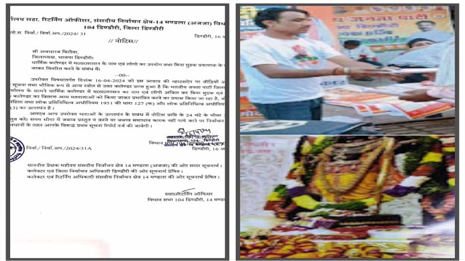 जिस पर जिलाध्यक्ष भारतीय जनता पार्टी जिला डिण्डौरी को आदर्श आचरण संहिता का उल्लघंन एवं लोक प्रतिनिधित्व अधिनियम 1951 की धारा 127क एवं धारा 123(3) के प्रावधानों के तहत सहायक रिटर्निंग अधिकारी डिंडोरी द्वारा नोटिस जारी किया गया है। नोटिस प्राप्ति के 24 घंटे के अंदर जबाव मांगा गया है, समय सीमा में अभाव प्रस्तुत न करने या जवाब समाधान कारक नहीं पाये जाने पर निर्वाचन अपराधों के सुसंगत प्रावधानों के तहत प्रथम सूचना रिपोर्ट दर्ज करने की कार्यवाही की जाएगी।