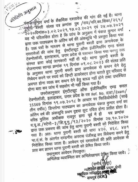 लेकिन कार्रवाई नहीं होने पर मामला कोर्ट चला गया। पंकज कुमार वर्मा पर करोड़ों के घोटाले के आरोपों की भी जांच जारी है। पंकज कुमार वर्मा की शैक्षणिक दस्तावेजों की जांच की गई। थाना पुरानी बस्ती द्वारा इंस्टीट्यूट आॅफ इंजीनियरिंग एंड रूरल टेक्नोलॉजी, इलाहाबाद, उत्तर प्रदेश से पत्राचार किया गया परन्तु उक्त संस्था द्वारा कोई जानकारी नहीं दी गई। अब कोर्ट के आदेश पर पुरानी बस्ती पुलिस ने धारा 420, 468, 471 के तहत कार्रवाई शुरू कर दी है।