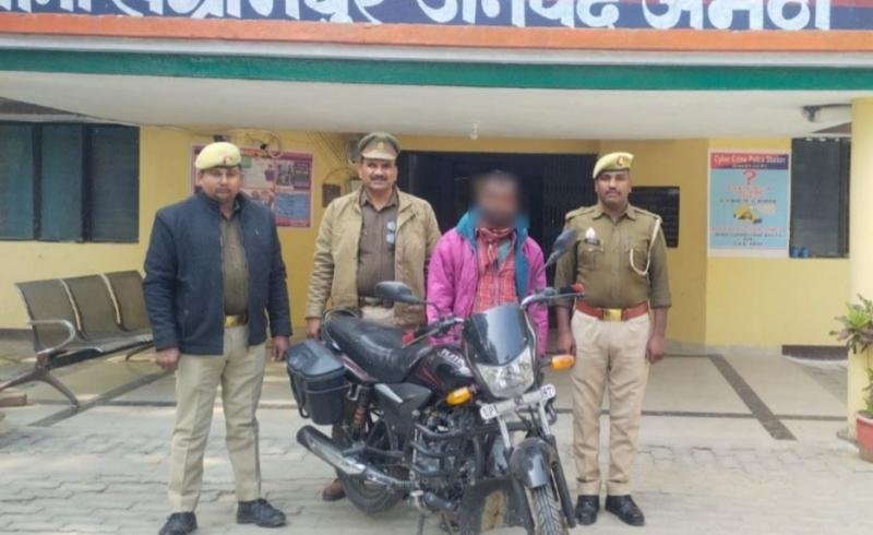अमेठी।थाना संग्रामपुर पुलिस ने चेकिंग के दौरान मुखबिर की सूचना पर चोरी की बाइक के साथ एक युवक को गिरफ्तार किया।पुलिस के मुताबिक,मुखबिर की सूचना पर प्लेटिना मोटरसाइकिल सवार को रोका गया और कागजात मांगे,लेकिन वह कोई कागज़ नहीं दिखा सका।पूछताछ में युवक की पहचान सोनू पुत्र राम आसरे निवासी ग्राम सोइया, रामगढ़, संग्रामपुर के रूप में हुई। उसने स्वीकार किया कि यह मोटरसाइकिल उसने 5 दिसम्बर को गडेरी चौराहे के पास बाज़ार से चुराई थी।पुलिस ने बाइक बरामद कर चोरी से संबंधित दर्ज मामले में सुसंगत धारा की बढ़ोत्तरी की है