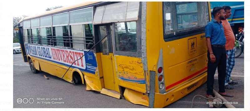 भोपाल । आज राजधानी भोपाल के रायसेन रोड पर एक बड़ी लापरवाही का मामला सामने आया, जब सेल ग्लोबल यूनिवर्सिटी के छात्रों को लेकर कॉलेज जा रही बस ( महाराष्ट्र पासिंग ) MH34AB8055 के पीछे के दोनों टायर अचानक निकल गए , जिससे बस में सवार कई छात्रों को गंभीर चोटें आई हैं हादसे के बाद छात्रों को अयोध्या नगर स्थित आरएनए मल्टीस्पेशलिटी अस्पताल में भर्ती करवाया गया हैं । इस गंभीर हादसे के बाद NSUI प्रदेश उपाध्यक्ष रवि परमार ने शासन-प्रशासन पर कड़ा प्रहार करते हुए कहा कि कुछ ही दिन पहले भोपाल में हुए बस हादसे के बावजूद सरकार और प्रशासन की नींद अब तक नहीं खुली है। राजधानी में बिना फिटनेस की सैकड़ों स्कूल-कॉलेज बसें धड़ल्ले से सड़कों पर दौड़ रही हैं, जिससे छात्र-छात्राओं और आम जनता की जान खतरे में पड़ी हुई है। रवि परमार ने आरोप लगाया कि सेल ग्लोबल यूनिवर्सिटी के संचालक और बस संचालक ने जानबूझकर बिना तकनीकी जांच के वाहन को छात्रों के परिवहन में लगाया, जो गंभीर आपराधिक लापरवाही है। उन्होंने यह भी कहा कि ऐसी घटनाओं से स्पष्ट होता है कि प्रशासनिक निगरानी पूरी तरह विफल हो चुकी है।