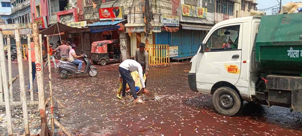 निगम आयुक्त हरेन्द्र नारायण द्वारा मूलभूत सुविधाओं के अंतर्गत साफ-सफाई व्यवस्था को उच्च स्तरीय बनाये रखने के निर्देशों के परिपालन में निगम के जोन क्र. 02, 04 एवं 05 के सफाई अमले द्वारा रंगपंचमी चल समारोह प्रारंभ स्थल से समापन स्थल तक के सभी मार्गों एवं उसके आसपास के क्षेत्रों की अल्प समय में ही पूर्ण रूप से साफ-सफाई की। चल समारोह के समापन उपरांत सुभाष चैक, जुमेराती, भवानी चैक, इतवारा, मंगलवारा, चैक बाजार एवं हनुमानगंज क्षेत्र के सभी मार्गों एवं उसके आसपास के क्षेत्रों की सफाई व्यवस्था जोन क्र. 02, 04 एवं 05 के सहायक स्वास्थ्य अधिकारियों के निर्देशन में संपन्न की गई।