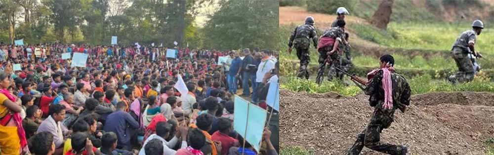 छत्तीसगढ़ के बीजोपुर के मुतवेंडी में बीते दिनों नक्सली और जवानों के बीच जमकर गोलीबारी की गई थी। इस गोलीबारी के दौरान क्रास फायरिंग में 6 माह की मासूम की मौत हो गई थी। वहीं दो जवान भी घायल हुए थे। अब मासूम की मौत के बाद इलाके के ग्रामीण आदिवासी जंगल में बड़ी संख्या में आंदोलन पर उतर आए है। ग्रामीणों का आरोप सीधा छत्तीसगढ़ की साय सरकार पर हैं।