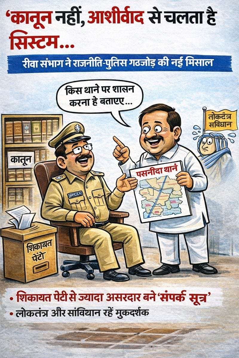 रीवा।रीवा संभाग की राजनीति और पुलिस व्यवस्था के पवित्र गठजोड़ का एक और “शानदार” उदाहरण उस वक्त सामने आया, जब के. पूर साहब किसी जनसमस्या को लेकर नहीं, बल्कि अपने भविष्य की कुर्सी का नक्शा लेकर संभाग के एक वरिष्ठ पुलिस अधिकारी के घर पहुँच गए।सूत्रों के मुताबिक, अधिकारी महोदय ने कानून की मोटी-मोटी किताबें अलमारी में बंद करते हुए बड़े आत्मीय स्वर में कहा—“समस्या-वमस्या छोड़िए पुअर साहब, पहले यह बताइए कि किस थाने पर शासन करना है। मनचाहा थाना मिल जाएगा, बाकी सब अपने आप मैनेज हो जाएगा।”बताया जा रहा है कि इस ऐतिहासिक आश्वासन के बाद लोकतंत्र कुछ देर के लिए शर्म से पानी-पानी हो गया और संविधान ने चुपचाप करवट बदल ली। वहीं आम जनता अब यह सोचने को मजबूर है कि शिकायत पेटी में आवेदन डालना ज़्यादा बेहतर है या सीधे किसी “संपर्क सूत्र” की तलाश करना।गलियारों में चर्चा है कि आने वाले दिनों में थानों के नाम बदलकर “जनप्रतिनिधि सुविधा केंद्र” रख दिए जाएँगे, जहाँ कानून नहीं बल्कि सिफ़ारिश की सुनवाई हुआ करेगी।वैसे भी के. पूर साहब को एक ही संभाग में नौकरी करना कुछ ज़्यादा ही भा गया है। भर्ती से लेकर निरीक्षक बनने तक का उनका सफ़र मनमाफ़िक जगहों पर ही तय हुआ है—काबिलियत से नहीं, बल्कि… आप जानते ही हैं, कैसे।