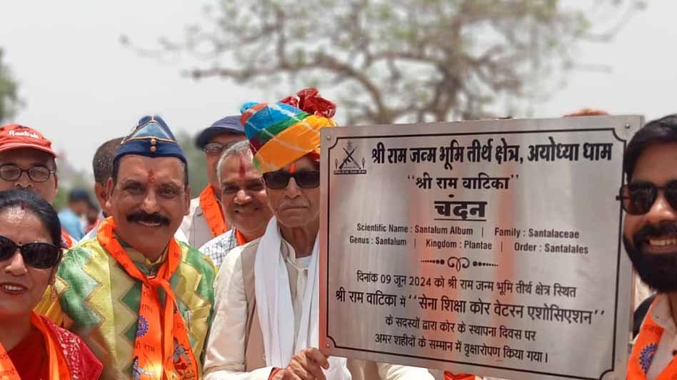 अखिल भारतीय पूर्व सैनिक सेवा परिषद और सेना शिक्षा कोर एसोसिएशन के संयुक्त तत्वाधान में श्री राम जन्मभूमि परिसर स्थित कुबेर टीला में वृक्षारोपण का शानदार कार्यक्रम आयोजित किया गया सर्वप्रथम श्री राम जन्मभूमि तीर्थ क्षेत्र ट्रस्ट अयोध्या धाम के महासचिव माननीय श्रीमान चंपतराय राय जी, श्री राम जन्मभूमि क्षेत्र ट्रस्ट के सदस्य माननीय डॉक्टर अनिल मिश्रा जी, दक्षिण भारत से पधारे हुए राष्ट्रीय स्वयंसेवक संघ के अखिल भारतीय पदाधिकारी श्रीमान गोपाल जी, स्टेशन कमांडर कर्नल नेगी साहब कर्नल सी पी सिंह साहब, सेना शिक्षा कोर वेटरन संगठन के अध्यक्ष महेंद्र सिंह राठौड़ तथा अखिल भारतीय पूर्व सैनिक सेवा परिषद अयोध्या धाम के अध्यक्ष श्री प्रकाश पाठक तथा महासचिव रामवीर सिंह के द्वारा साफा एवं टोपी पहनकर स्वागत किया गया तत्पश्चात पर्यावरण को लेकर माननीय चंपत राय जी का संबोधन हुआ, श्रीमान चंपत राय जी ने अपने संबोधन में अयोध्या की जलवायु और 67 एकड़ में फैले हुए राम मंदिर के परिसर में विभिन्न प्रकार के वृक्षों की चर्चा की और यहां के जलवायु के अनुकूल होने वाले वृक्षों के बारे में बताया उन्होंने अपने संबोधन में भारतीय सेना और पूर्व सैनिकों के संगठन को उत्तम बताते हुए अयोध्या राम मंदिर में अखिल भारतीय पूर्व सैनिक सेवा परिषद के कार्य की सराहना भी की।