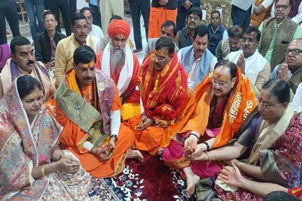 मुख्यमंत्री डॉ. मोहन यादव एवं केंद्रीय स्वास्थ्य एवं परिवार कल्याण मंत्री श्री जे.पी. नड्डा ने अपने उज्जैन प्रवास के दौरान दोपहर श्रीमहाकालेश्वर मंदिर पहुंचकर सपत्नीक दर्शन कर पूजन-अभिषेक किया। पूजन अभिषेक पं.श्री राजेश पुजारी, श्री राम पुजारी और श्री आकाश पुजारी द्वारा सम्पन्न कराया गया।